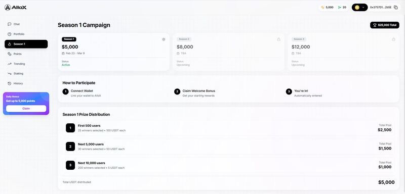 Join AlloX today and start claiming your daily bonus, gathering points, and participating in the AlloX AI Spring Campaign for a share of the $25,000 USDT prize pool.