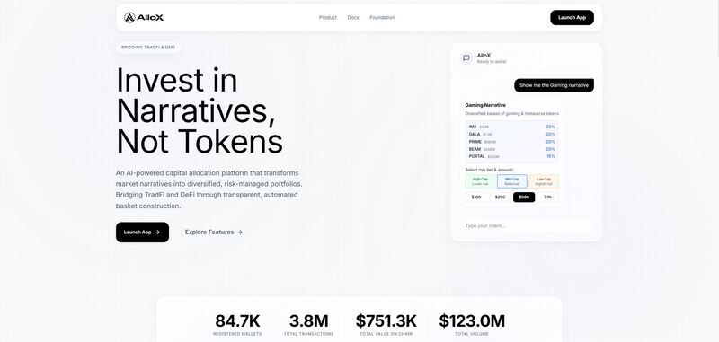 AlloX is an AI-powered capital allocation platform recently launched and designed to help investors build diversified, risk-managed portfolios in the narrative-driven crypto market. It leverages artificial intelligence and automation to bridge TradFi and DeFi, enabling clear, transparent capital allocation.
