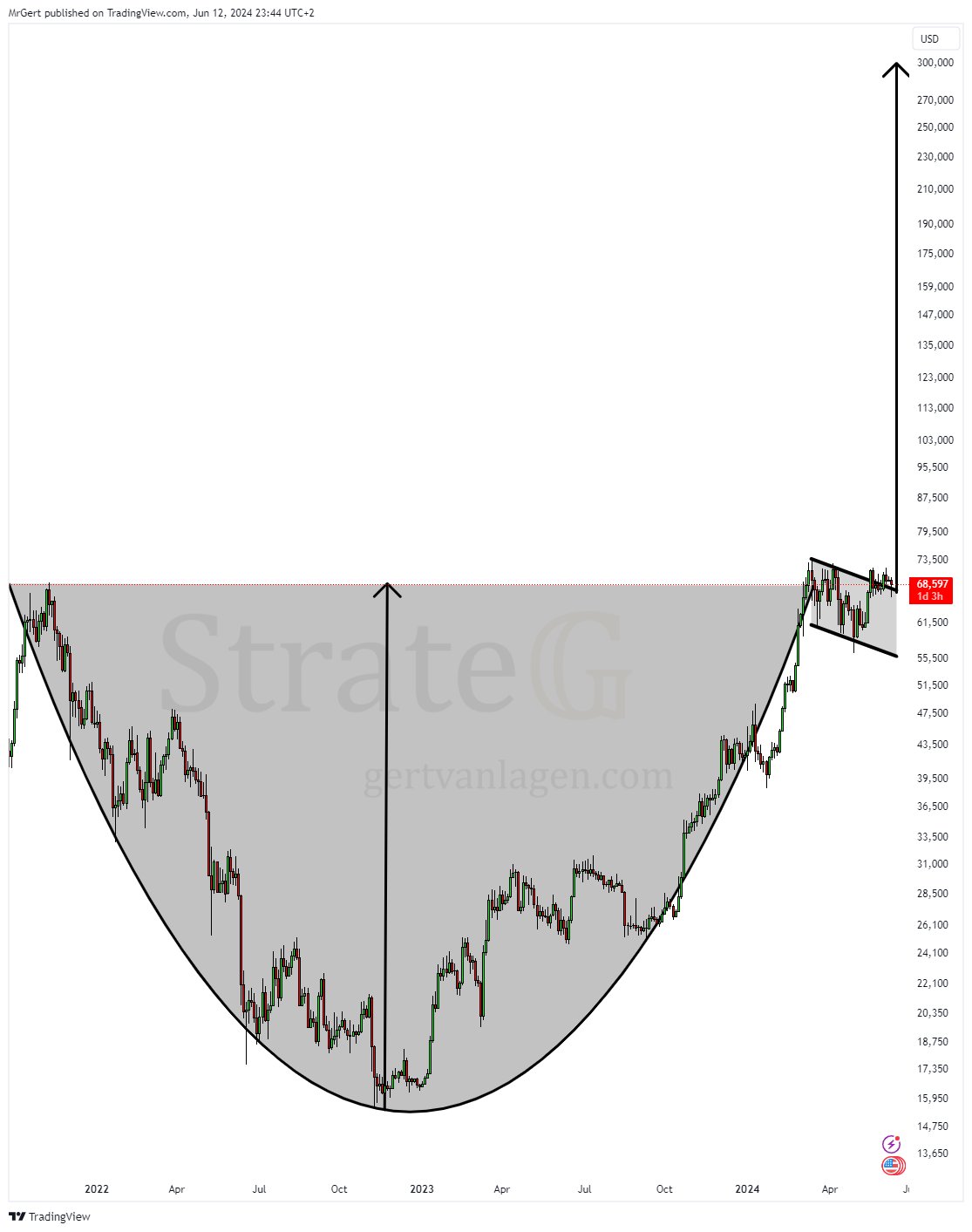 According to an analysis shared by renowned crypto analyst Gert van Lagen, the Bitcoin price chart has illustrated a significant technical pattern in the 3-day chart (BTC/USD) that could potentially signal an upsurge to as high as $300,000. Known as the “Cup with Handle,” this pattern is celebrated among traders for its predictive reliability and bullish implications.