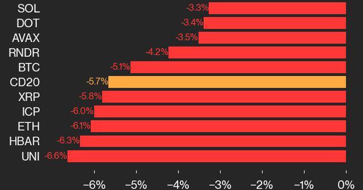 CoinDesk 20 Index Drops by 5.7% with Every Asset Posting Losses and LTC and ATOM Leading the Declines