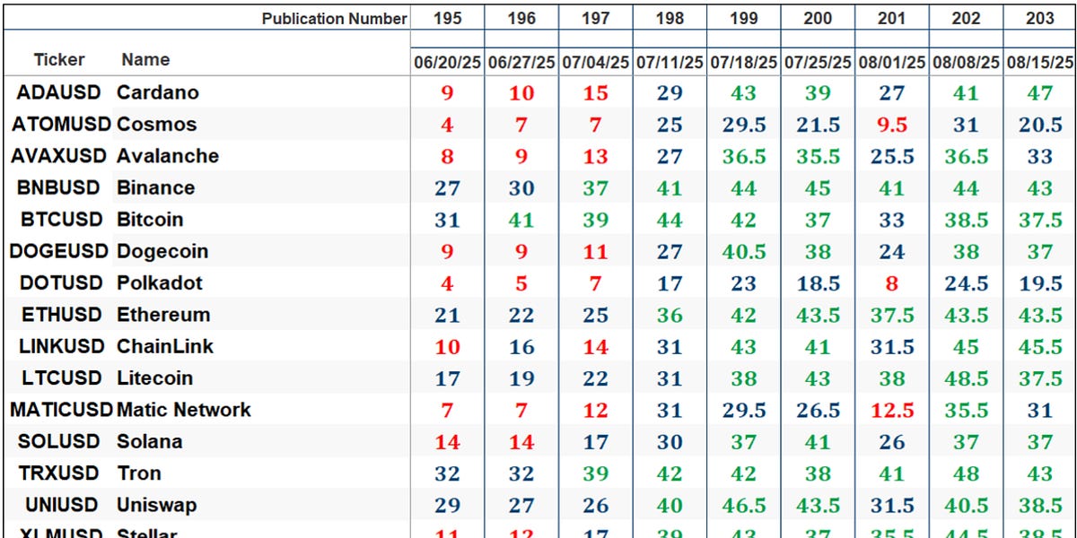 *The technical ranking system is a quantitative approach that utilizes multiple technical considerations that include but are not limited to trend, momentum, measurements of accumulation/distribution and relative strength. The TR of each individual Cryptocurrency can range from 0 to 50.