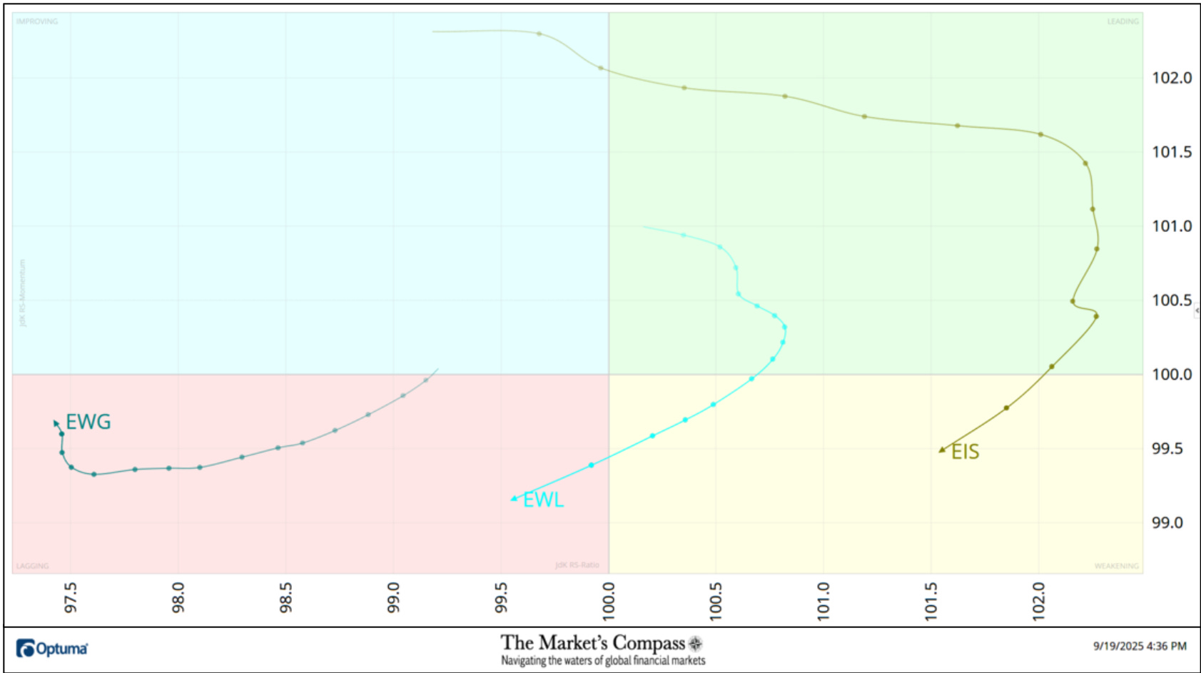 In the last DM ETF Study published on September 2nd for the week ending August 29th I brought attention to the iShares MSCI Israel Index Fund ETF (EIS) which had risen out of the Lagging Quadrant into the Improving Quadrant exhibiting positive Relative Strength Momentum. Although momentum began to slow, it nonetheless continued to notch positive Relative Strength until it began to roll over a week ago, last Tuesday displaying negative Relative Strength Momentum and late last week it fell into the Weakening Quadrant. The iShares MSCI Switzerland Index Fund ETF (EWL) has made a negative three quadrant move by falling out of the Leading Quadrant, dropping through the Weakening Quadrant and into the Lagging Quadrant at the end of last week it was underperforming the URTH on a Relative Strength basis. The iShares MSCI Germany Index Fund ETF has been a standout Relative Strength underperformer vs. the benchmark, as it has tracked sideways in the Lagging Quadrant until it hooked slightly higher at the end of last week.