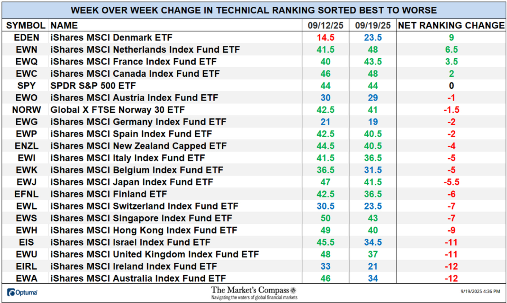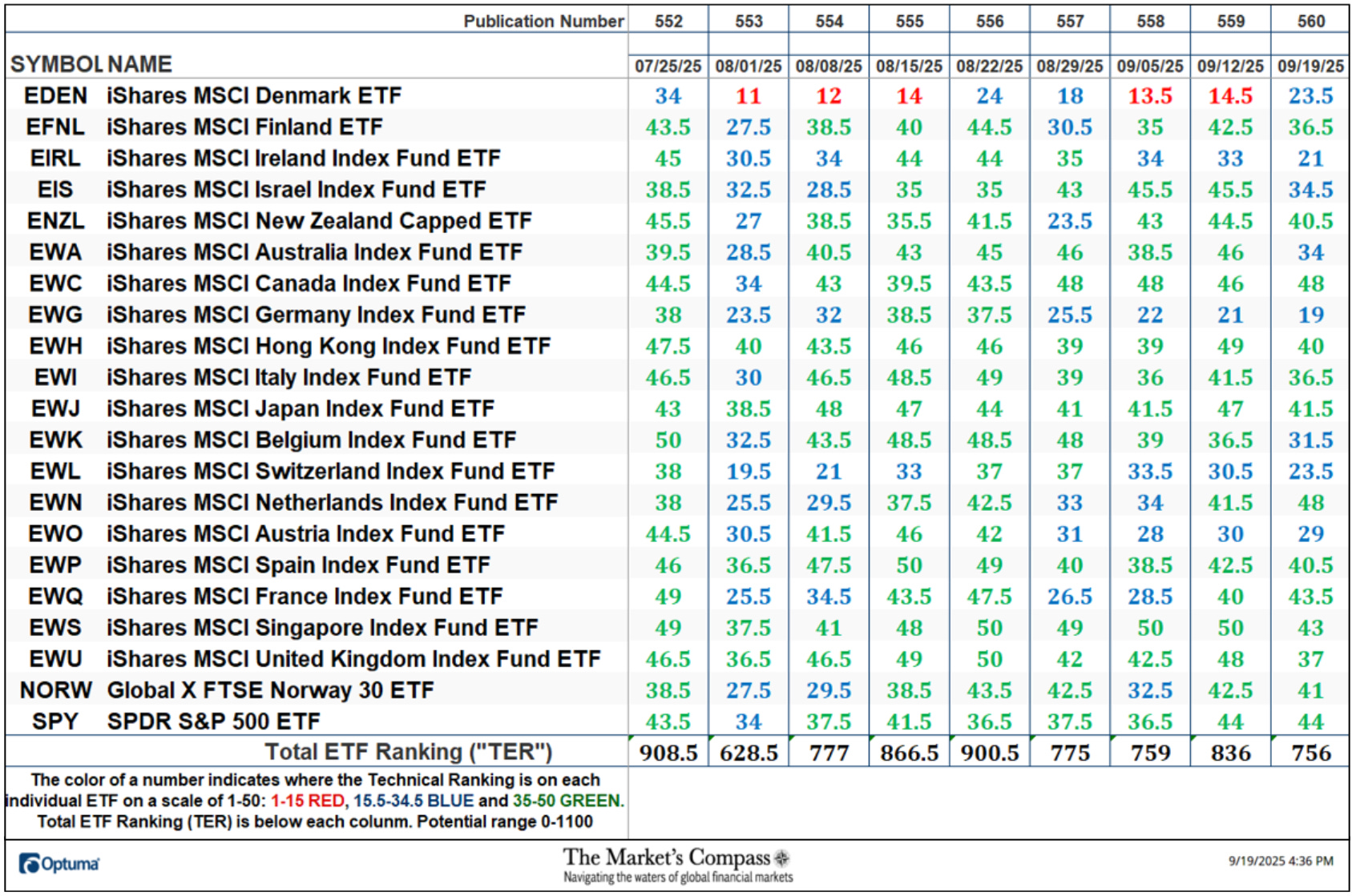 To understand the methodology used in constructing the objective DM Country ETF Individual Technical Rankings visit the mc’s technical indicators page at www.themarketscompass.com and select “dm country etfs”. What follows is a Cliff Notes version* of the full explanation…