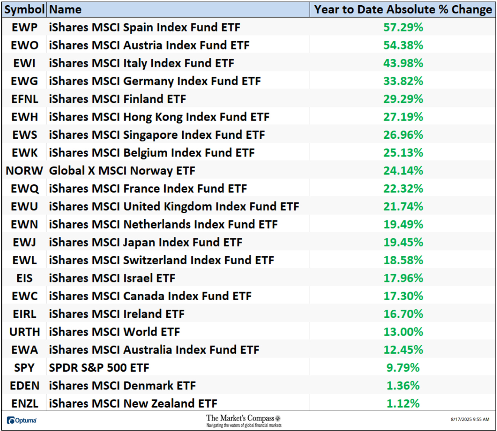 The YTD Average Absolute % price change of the twenty one Developed Markets County ETFs was +25.48% at the end of last week.