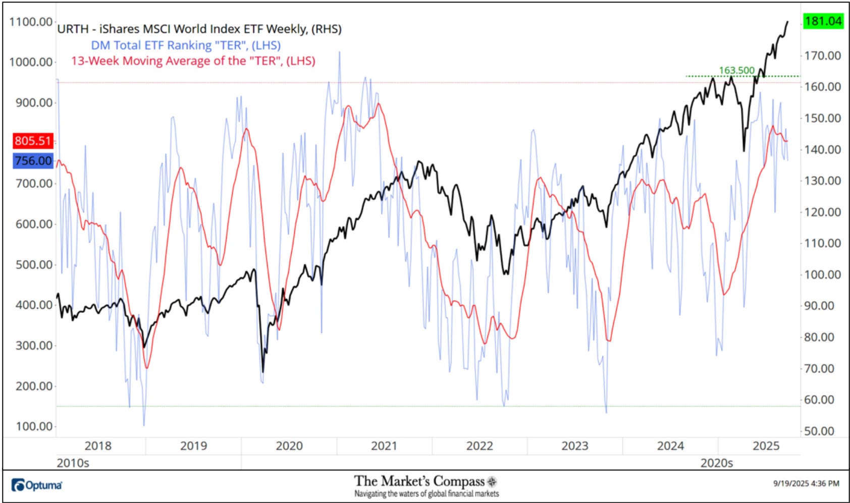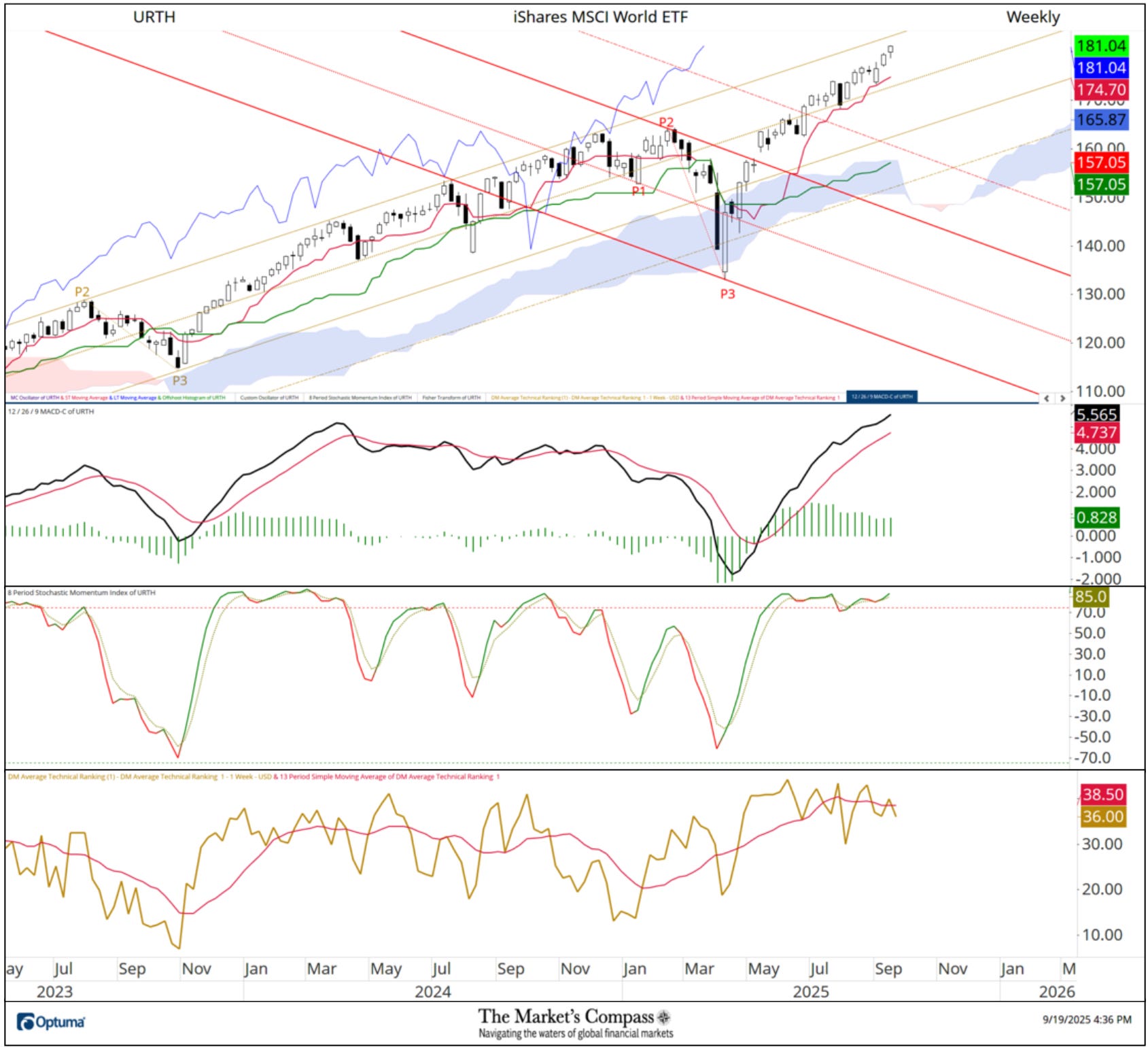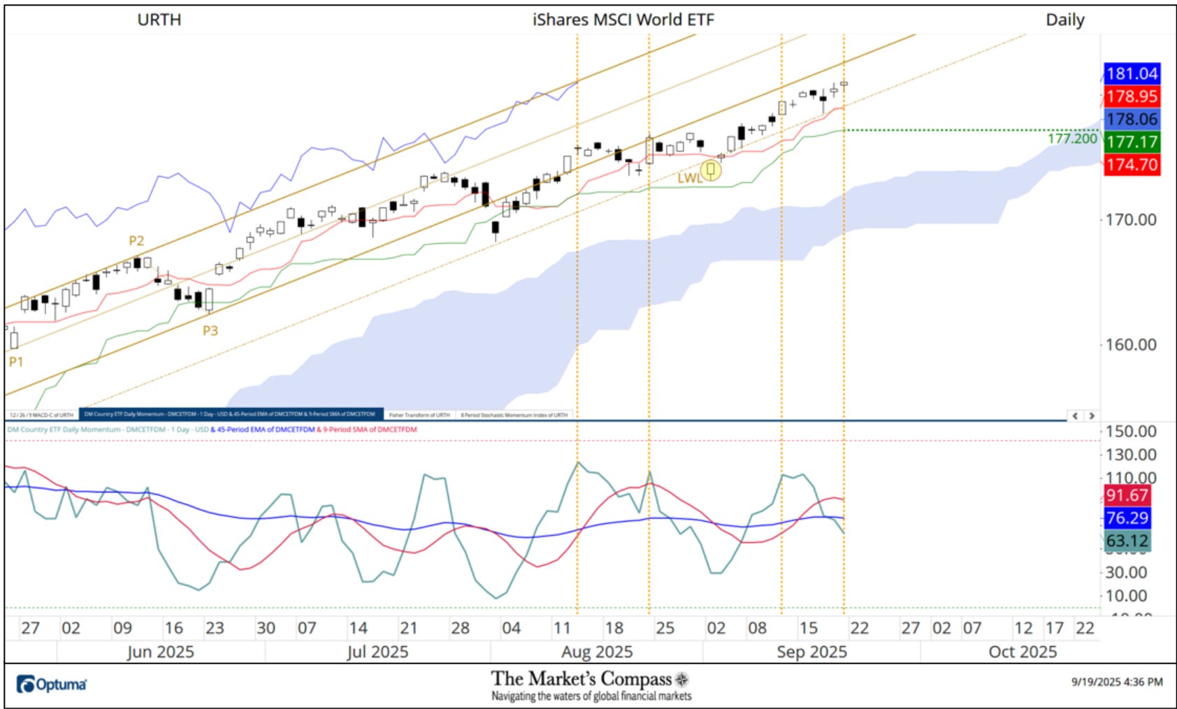 The iShares MSCI World Index ETF closed at yet another record weekly closing high at 181.04 but there continues to be a non-confirmation of the new price highs by The DM Total ETF Ranking (blue line) or “TER” as it prints lower highs and with it the 13-Week Moving Average of the “TER” (red line) is stumbling slightly lower. Oversold “TER” readings (150 or lower) and non-confirmations are normally more reliable for marking immediate price reversals at lows than extended periods of overbought at “TER” highs or non-confirmations at price highs. That said, it remains an indicator worth monitoring and as will be seen further into today’s Study there are currently other indicator signals that the URTH is over extended.