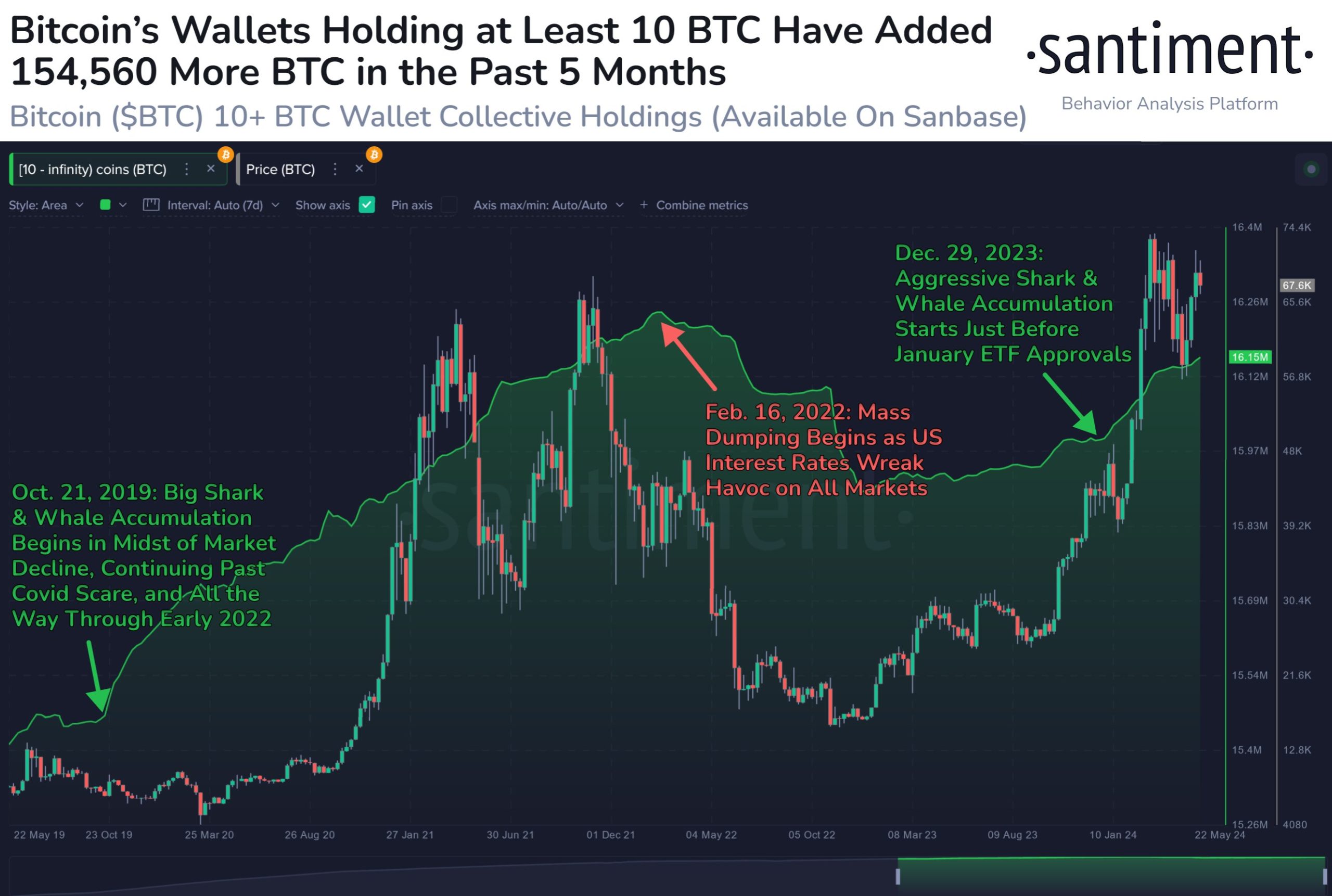 In a new post on X, Santiment has discussed about a metric that has historically been one of the top leading indicators in the sector. The metric in question is the total amount of supply held by the Bitcoin investors carrying at least 10 BTC in their wallets.