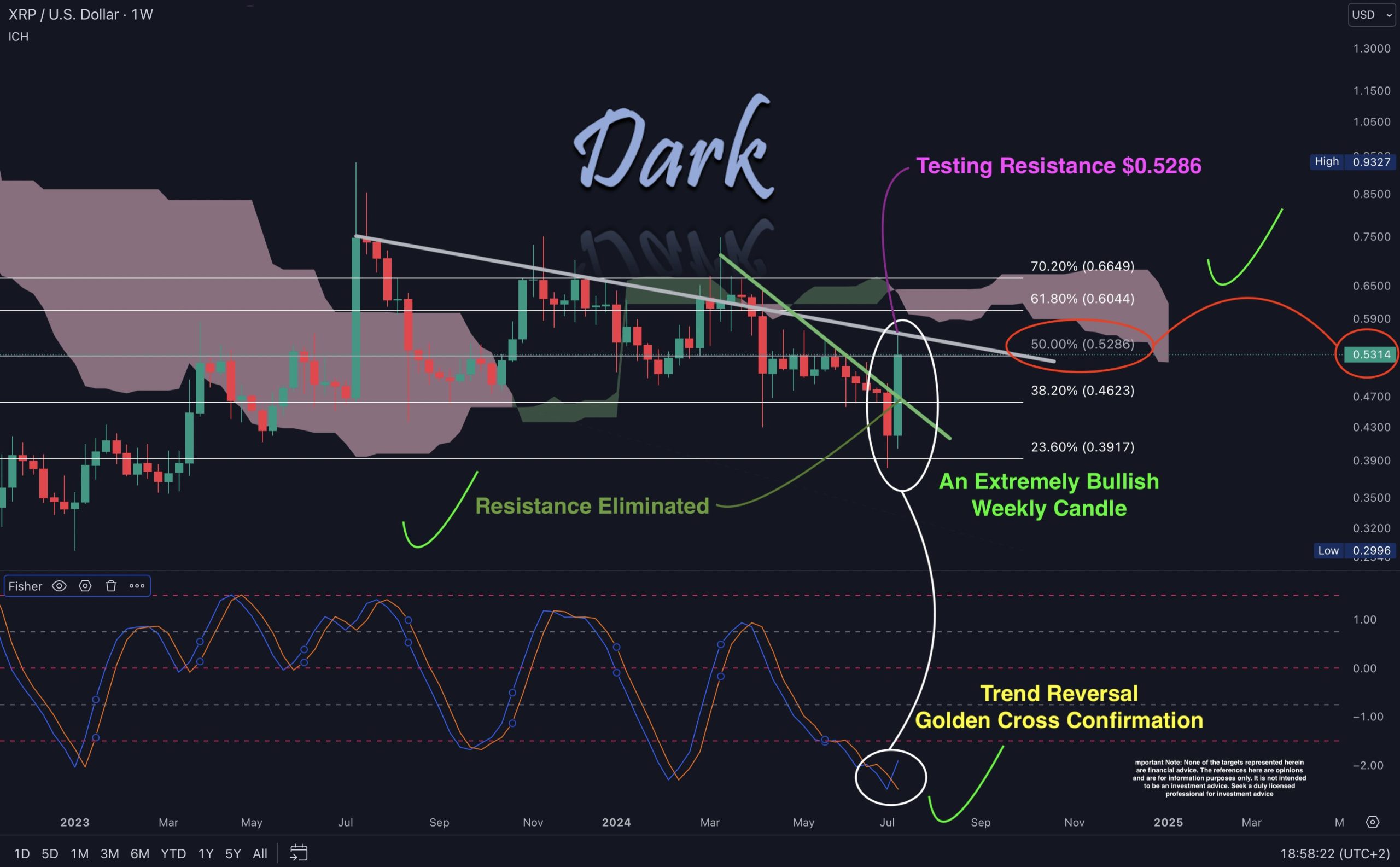 “Ladies & gentlemen, XRP had the highly bullish Reversal approval for the Fisher Indicator weekly. Initial resistance instantly broke at $0.4623!” the crypto analyst remarked.